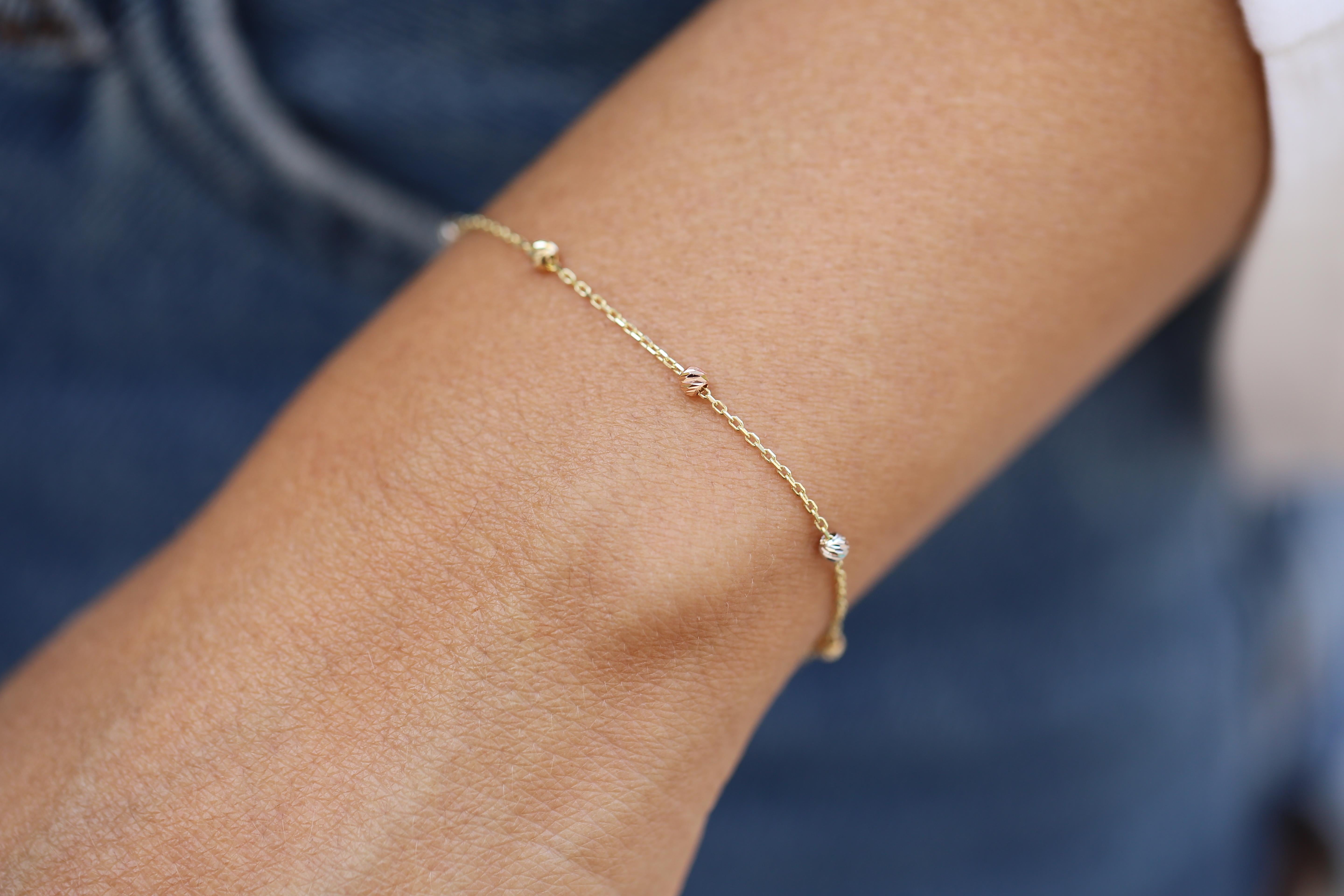 Altın Dorika Toplu Zincir Bright Bileklik, zarafeti ve şıklığı bir araya getiren etkileyici bir tasarıma sahip. 14 ayar altın kullanılarak üretilen bu bileklik, göz alıcı iç renk dorika toplarıyla detaylandırılmıştır. Her bir dorika top, bilekliğe zarif bir doku katarken, toplam yapısı ile modern bir estetik sunmaktadır.