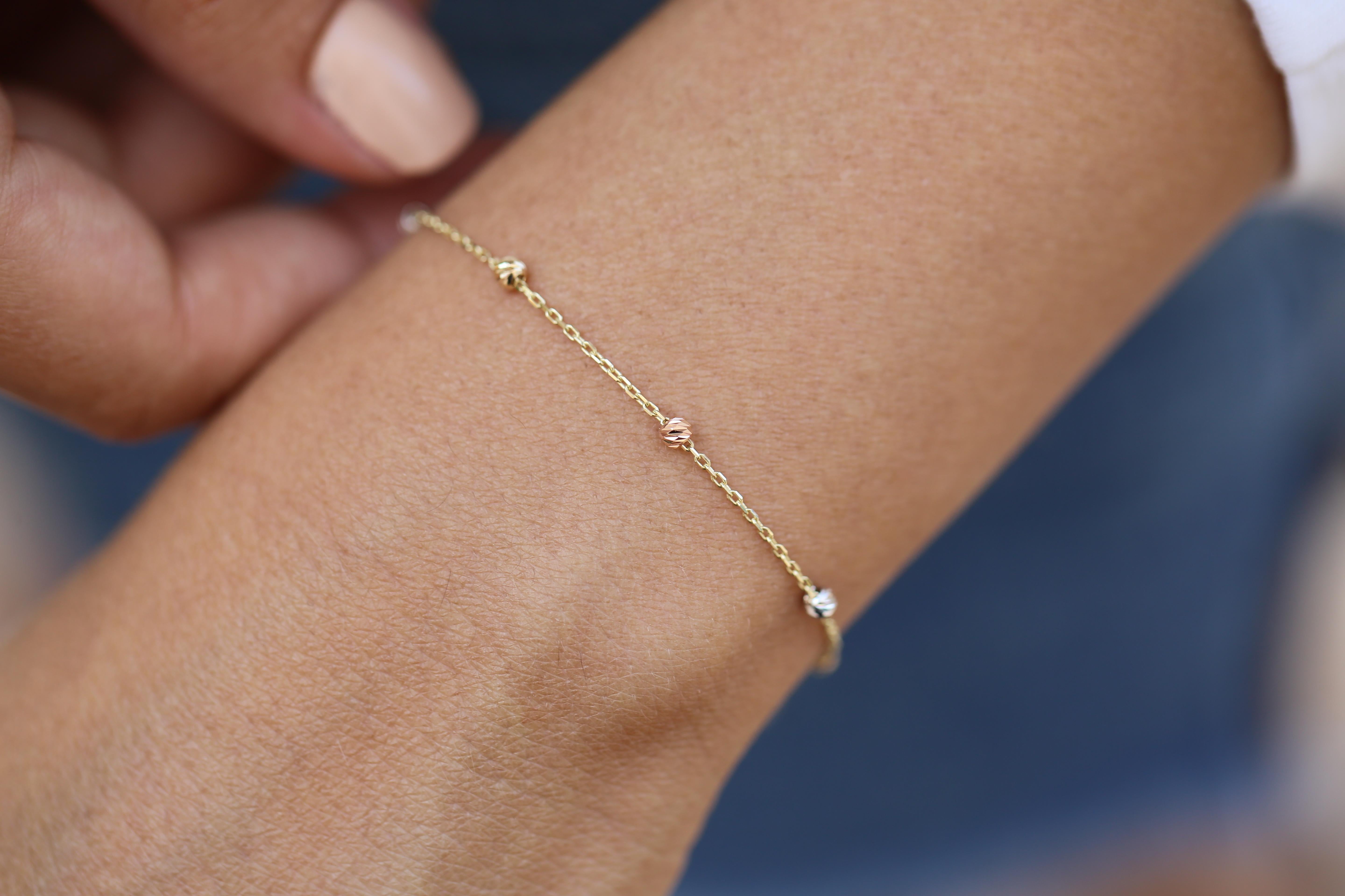 Bilekliğin zarif görünümü, günlük kombinlerden özel davetlere kadar her türlü kıyafetle mükemmel bir uyum sağlar. İç renk dorika toplar, bilekliğe dinamik bir hava katarak dikkat çekici bir stil oluşturur. İnce zincir yapısı, hafif ve rahat bir kullanım sunarak, bilekliğinizi gün boyu rahatça taşımanıza olanak tanır.