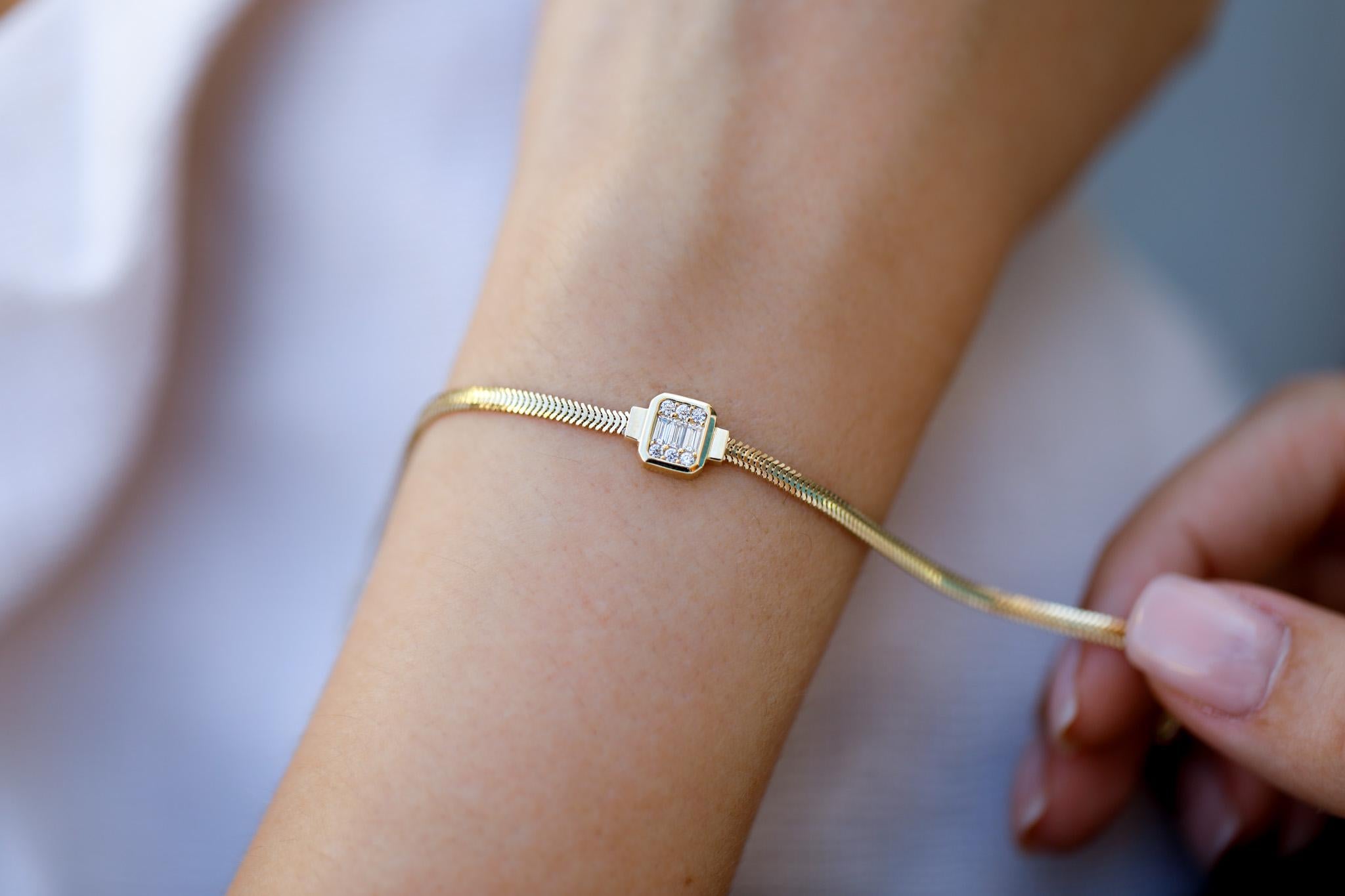 Baget taşlar, bilekliğin tasarımını tamamlayarak ona modern ve lüks bir hava katıyor. Bu bileklik, her yaşa ve her tarza hitap edebilecek şıklıkta olup, özel günlerde ya da günlük kullanımlarınızda bile mükemmel bir uyum sağlar. 14 ayar altın malzeme, bilekliğin uzun ömürlü olmasını sağlar ve yıllarca güvenle kullanılabilir.