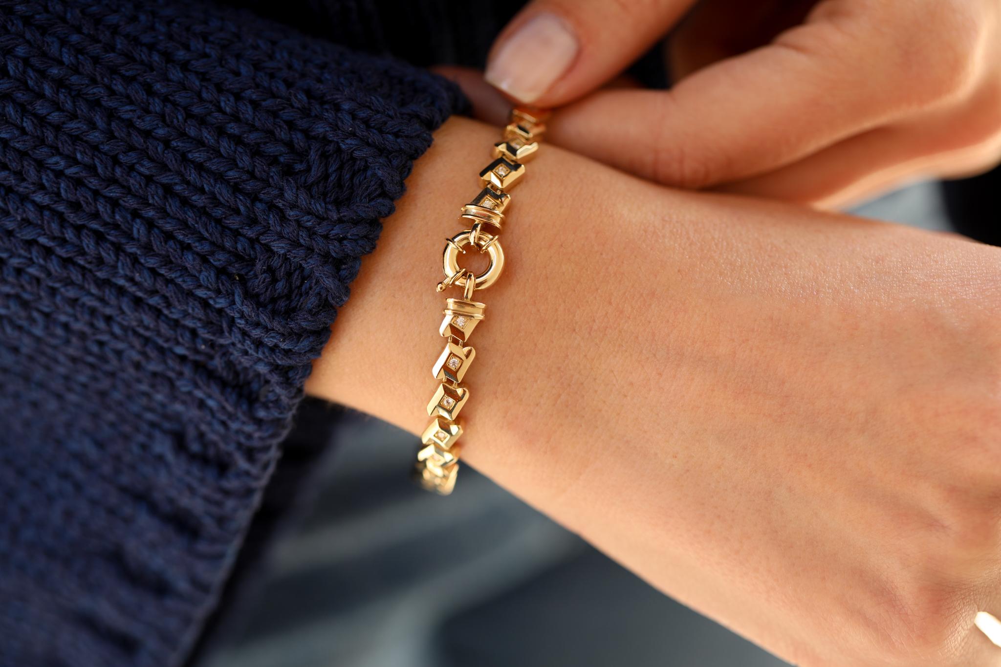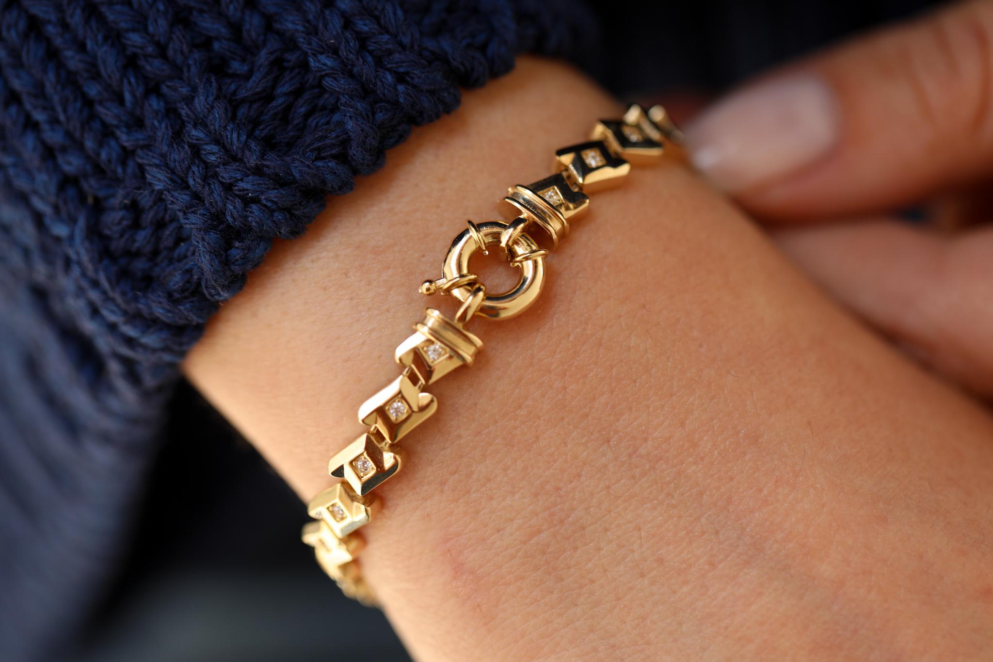 14 ayar altından üretilen bu bileklik, hem şık hem de günlük kullanıma uygun bir aksesuar olarak öne çıkıyor. Modern tasarımı, farklı stillerle kolayca kombinlenebilirken, taşların ışıltısı her anınıza zarafet katıyor. Her bir detayında özen ve kaliteyi barındıran bu parça, günün her anında stilinizi tamamlayacak mükemmel bir seçenek.