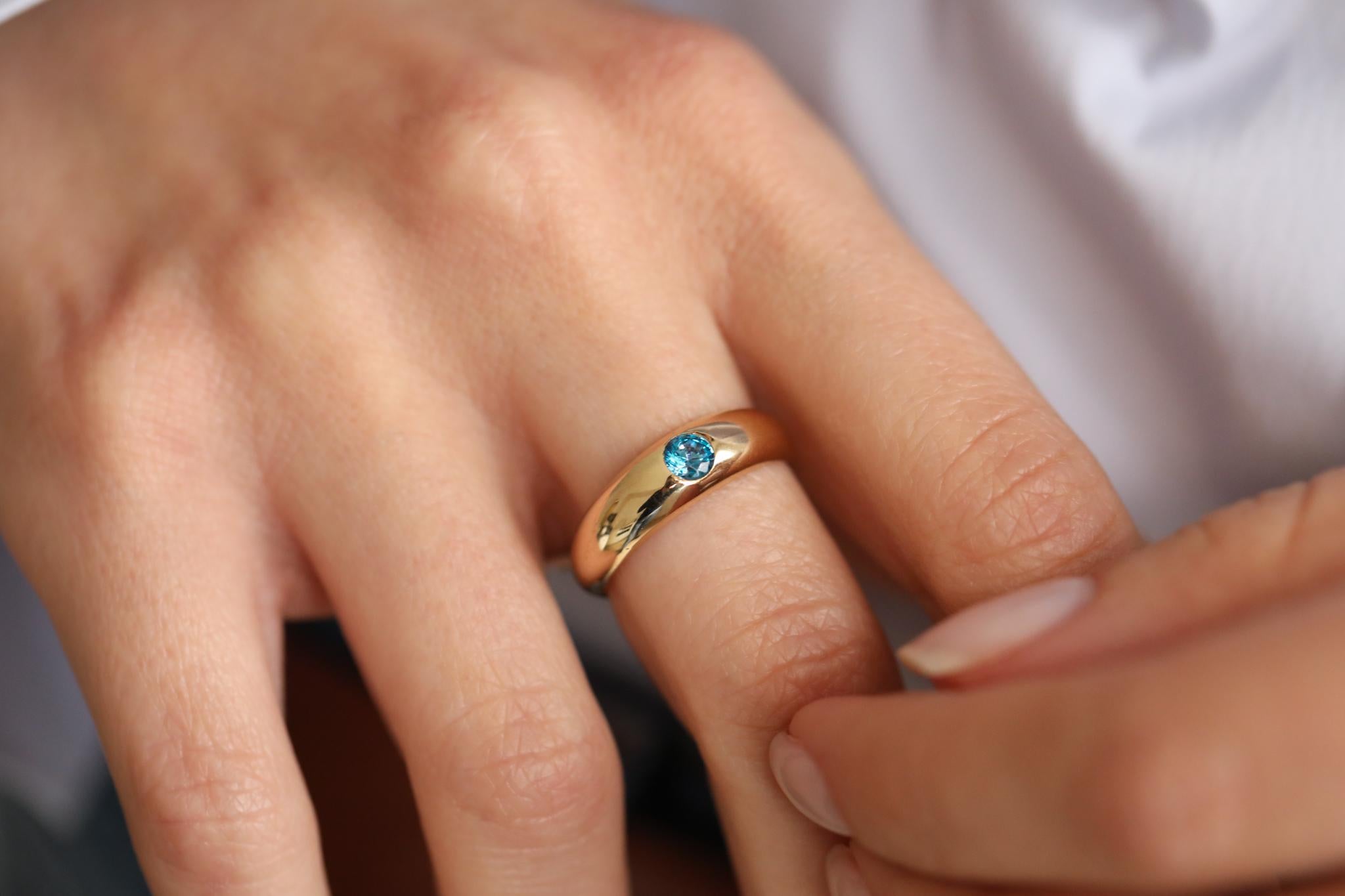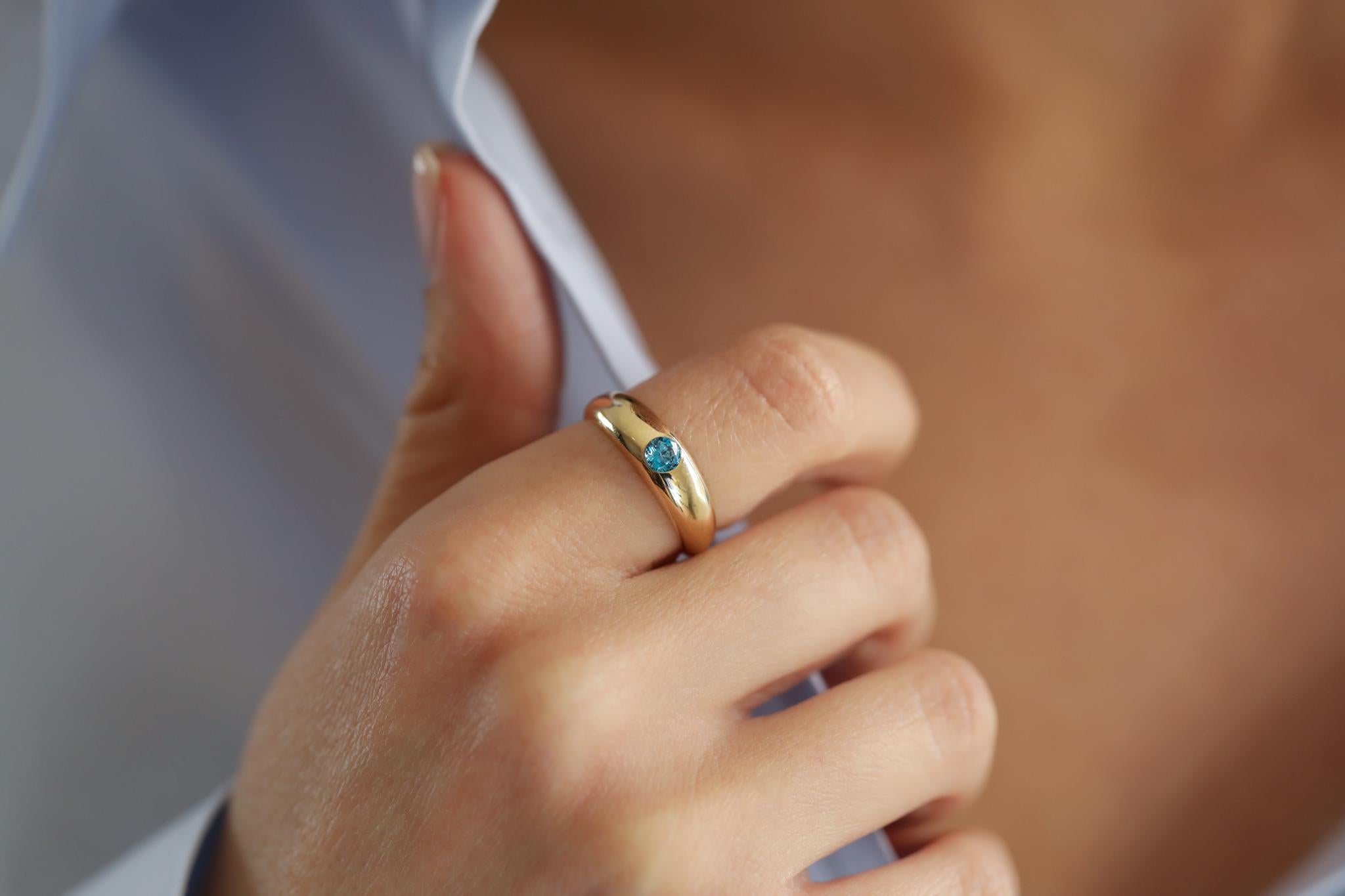 Aqua Tektaşlı Bombe Altın Yüzük, şıklığı ve zarif tasarımıyla günlük hayatta stilinize eşlik edecek özel bir parçadır. 14 ayar altından üretilen bu yüzük, sade bombe yapısı ve üst kısmındaki aqua mavi taşıyla dikkat çekiyor. Hem modern hem de vintage bir hava sunan tasarımı, renkli taşları sevenler için ideal bir seçimdir.