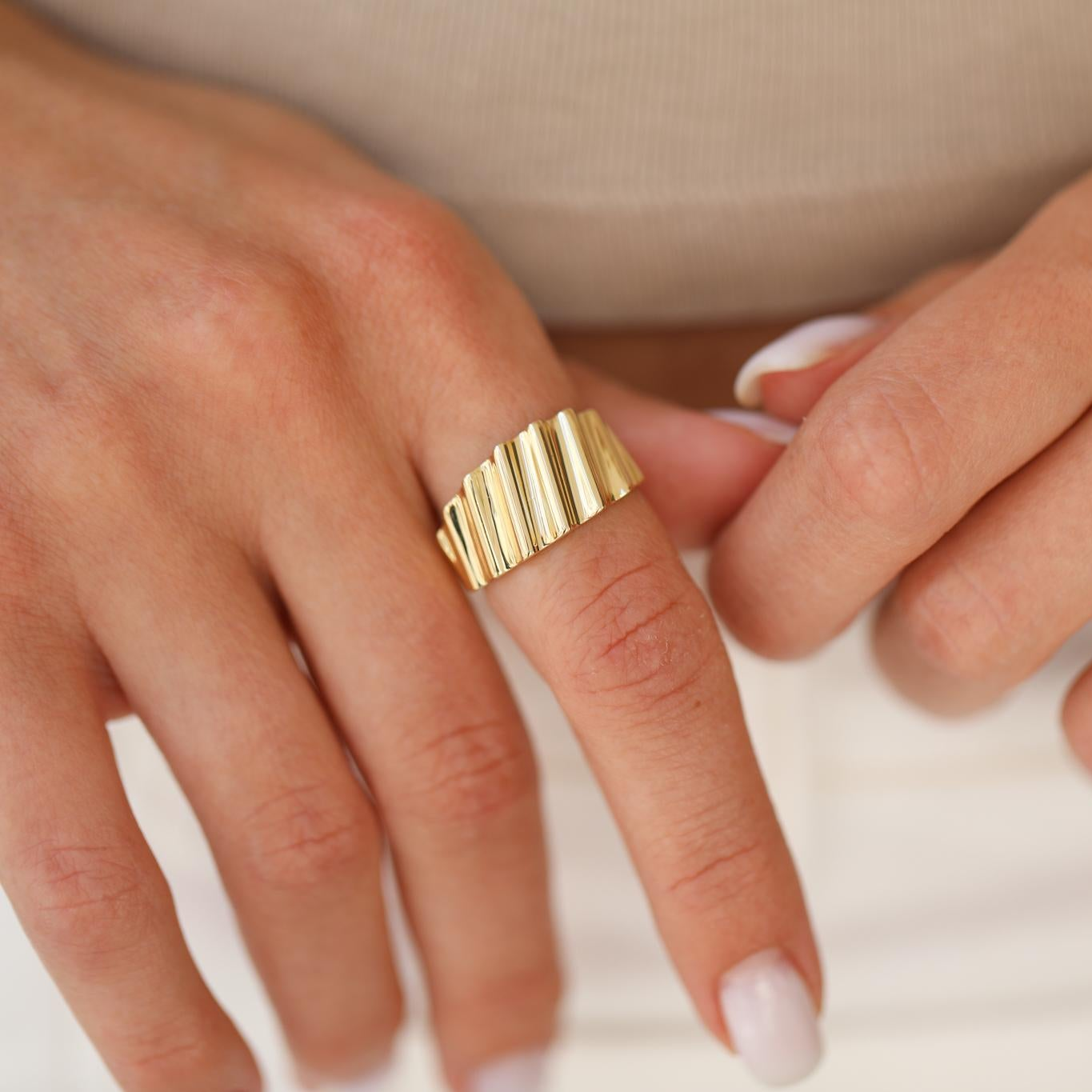 Bombe ve oluklu tasarımın birleşimi, yüzüğe sofistike bir doku kazandırırken, zarafeti ve gücü bir arada sunuyor. Hem günlük kullanım için hem de özel anlarınızda şıklığınızı tamamlamak için ideal bir tercih. Yüzüğün hafif yapısı, gün boyu rahat kullanım sağlar.