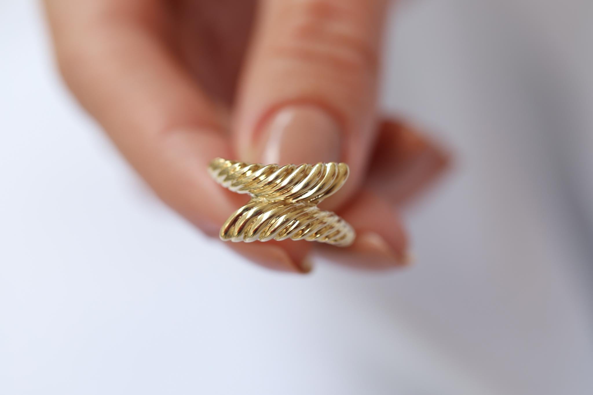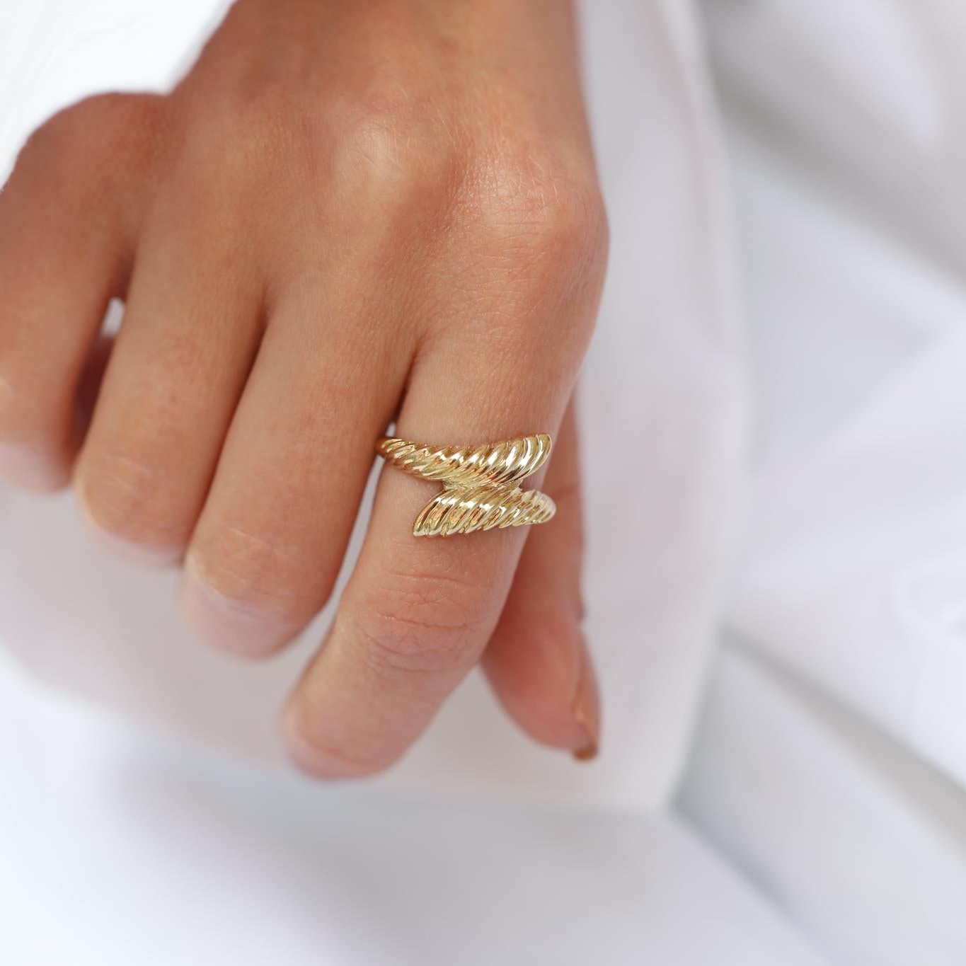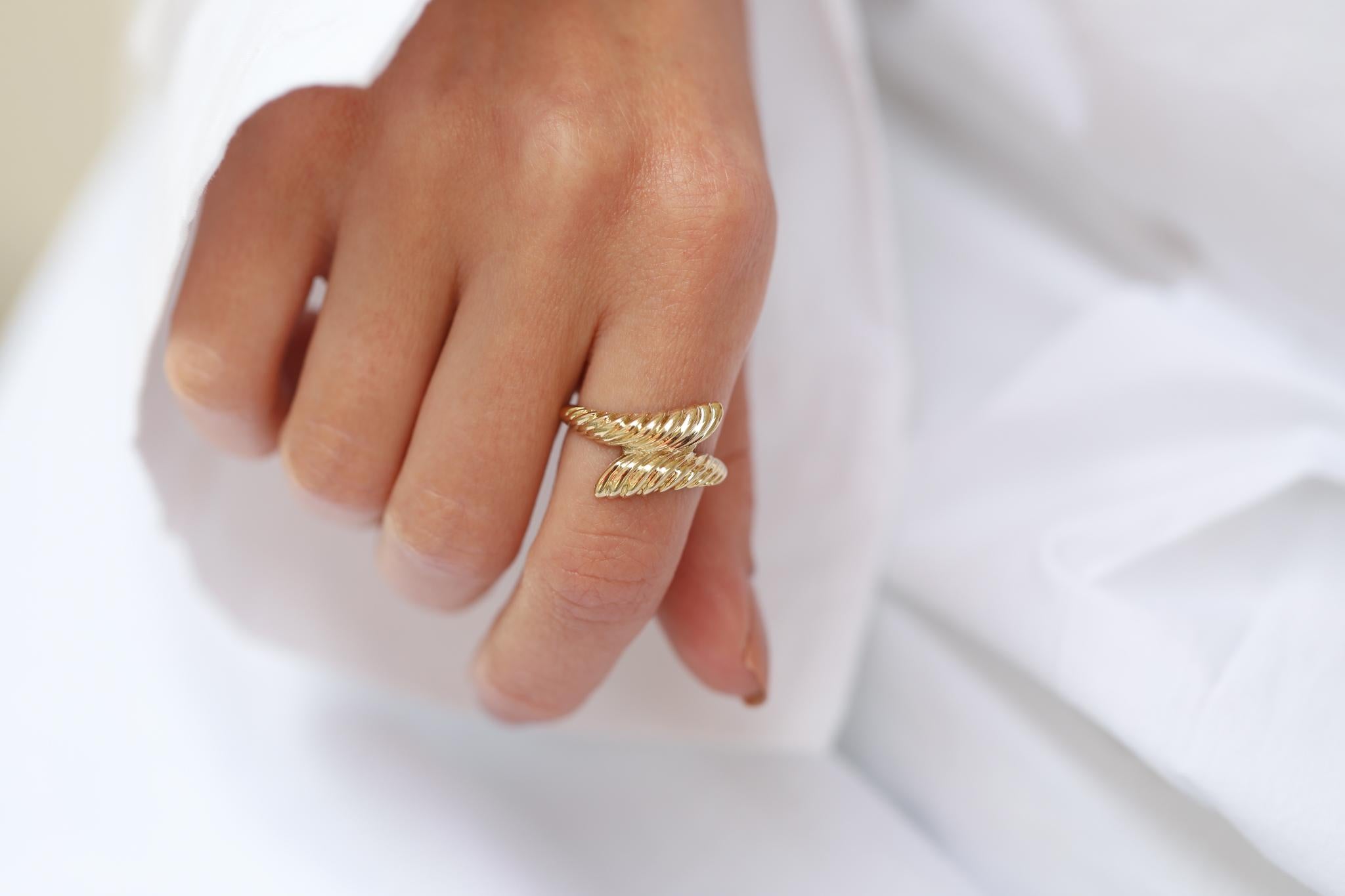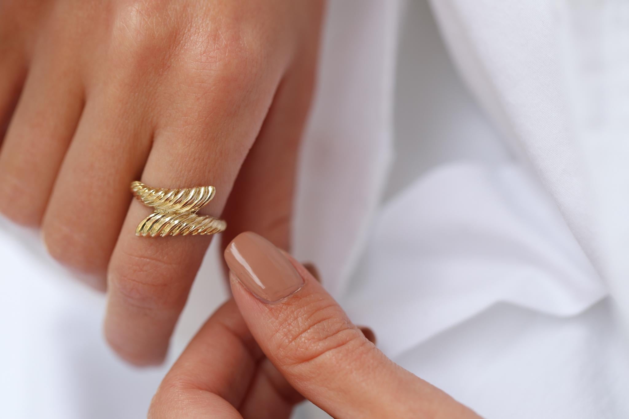 Çizgi Yaprak Altın Yüzük, zarif çizgileri ve yaprak dokusunu andıran burgulu tasarımıyla doğal bir stil sunuyor. Yüzüğün ikili yapısı, parmakta adeta bir yaprak gibi zarifçe kıvrılıyor ve her açıdan ışıltılı ve zengin bir görünüm kazandırıyor. İnce detayları ve şık altın dokusuyla, hem günlük kullanımda hem de özel davetlerde tarzınıza farklı bir dokunuş katıyor.