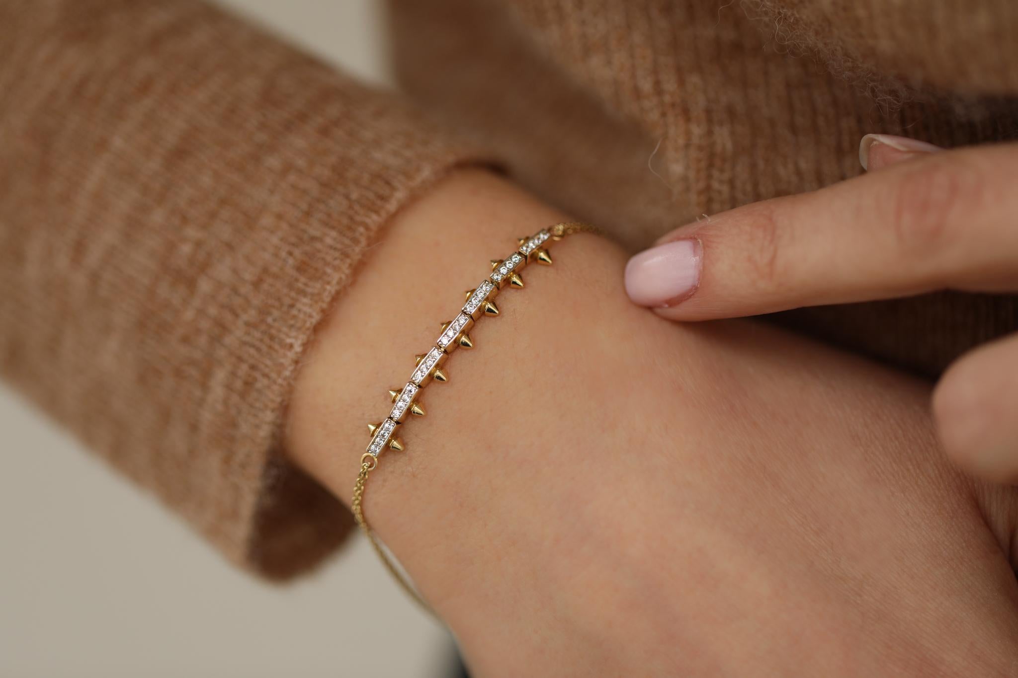 Altın Paddy Bileklik, zarif tasarımıyla göz alıcı bir şıklık sunuyor. Taşlı gövdesi, bilekliğe parlaklık katarak her anınıza ışıltı eklerken, mini ok detayları modern bir görünüm sağlar. İnce çift zincir yapısı, minimalizmi ön planda tutarak günlük kullanım için mükemmel bir seçenek haline getiriyor.