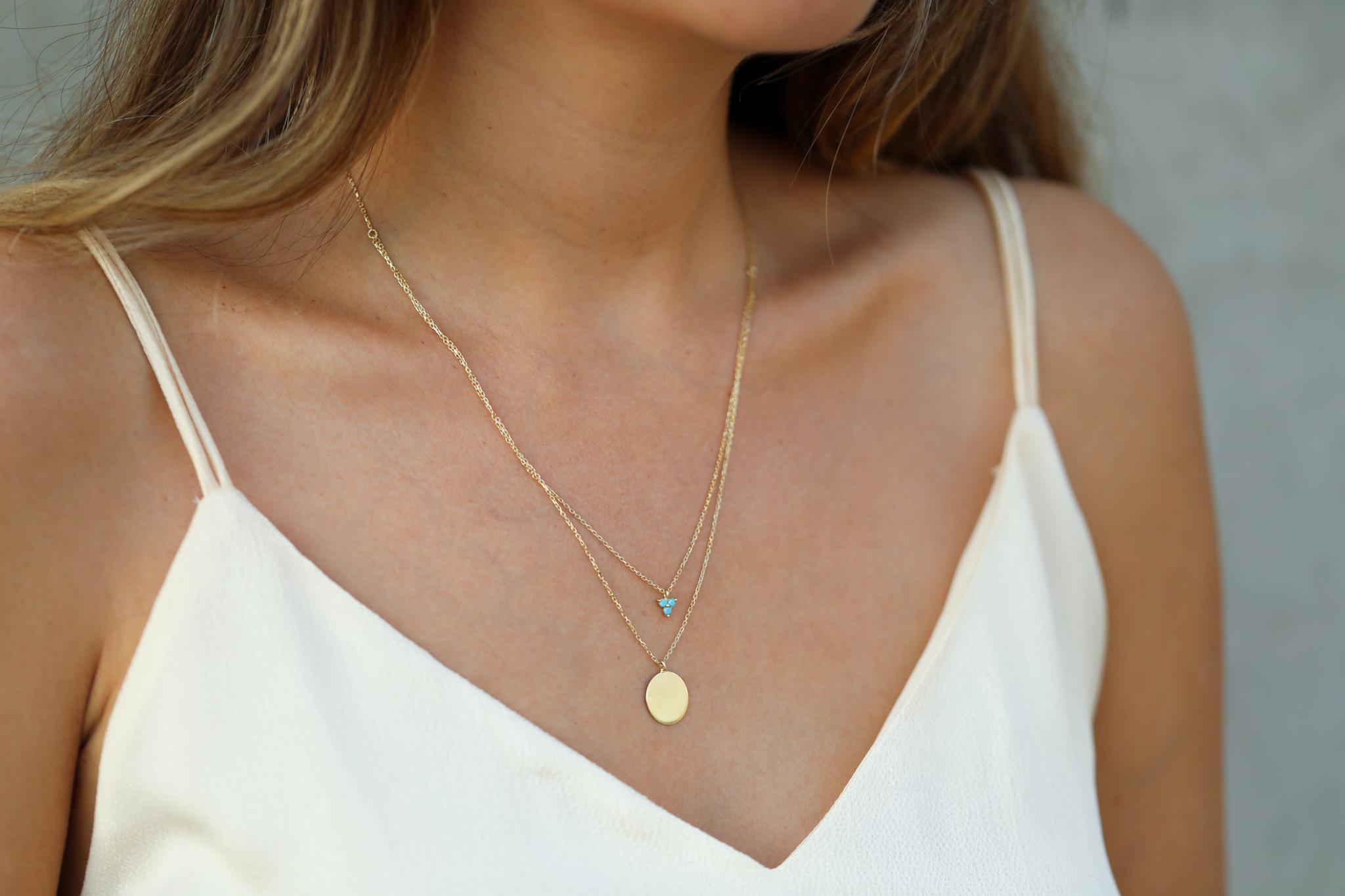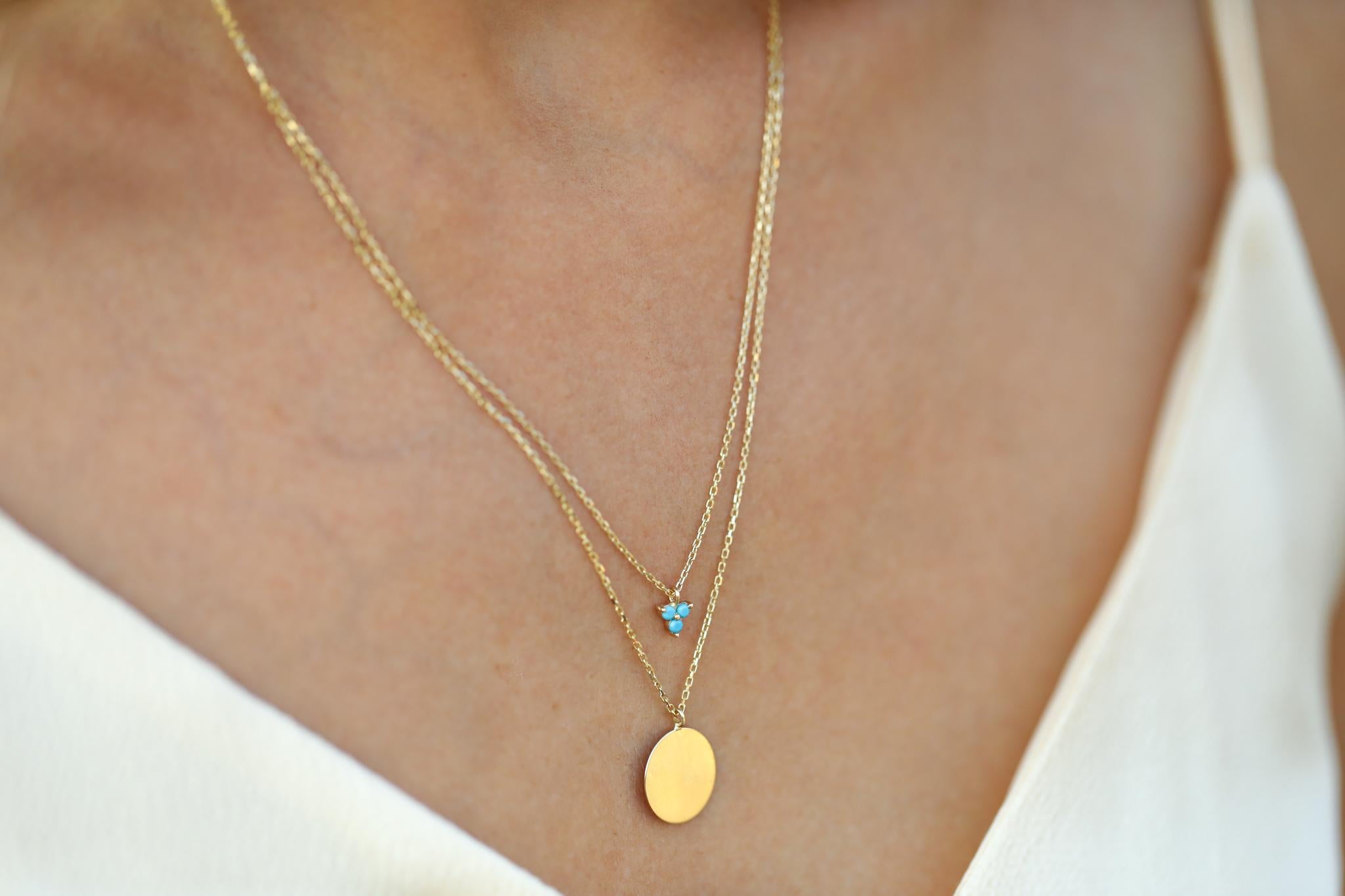 Bu kolye, hem günlük kullanımda hem de özel anlarda stilinizi tamamlamak için harika bir seçenektir. Yuvarlak plaka, kişisel ifadelerinizi yansıtma fırsatı verirken, firuze taşlarının canlı rengi tasarıma hareket katar. Modern çizgileri ve şık duruşuyla, her yaştan kadın için mükemmel bir hediye alternatifi sunmaktadır.