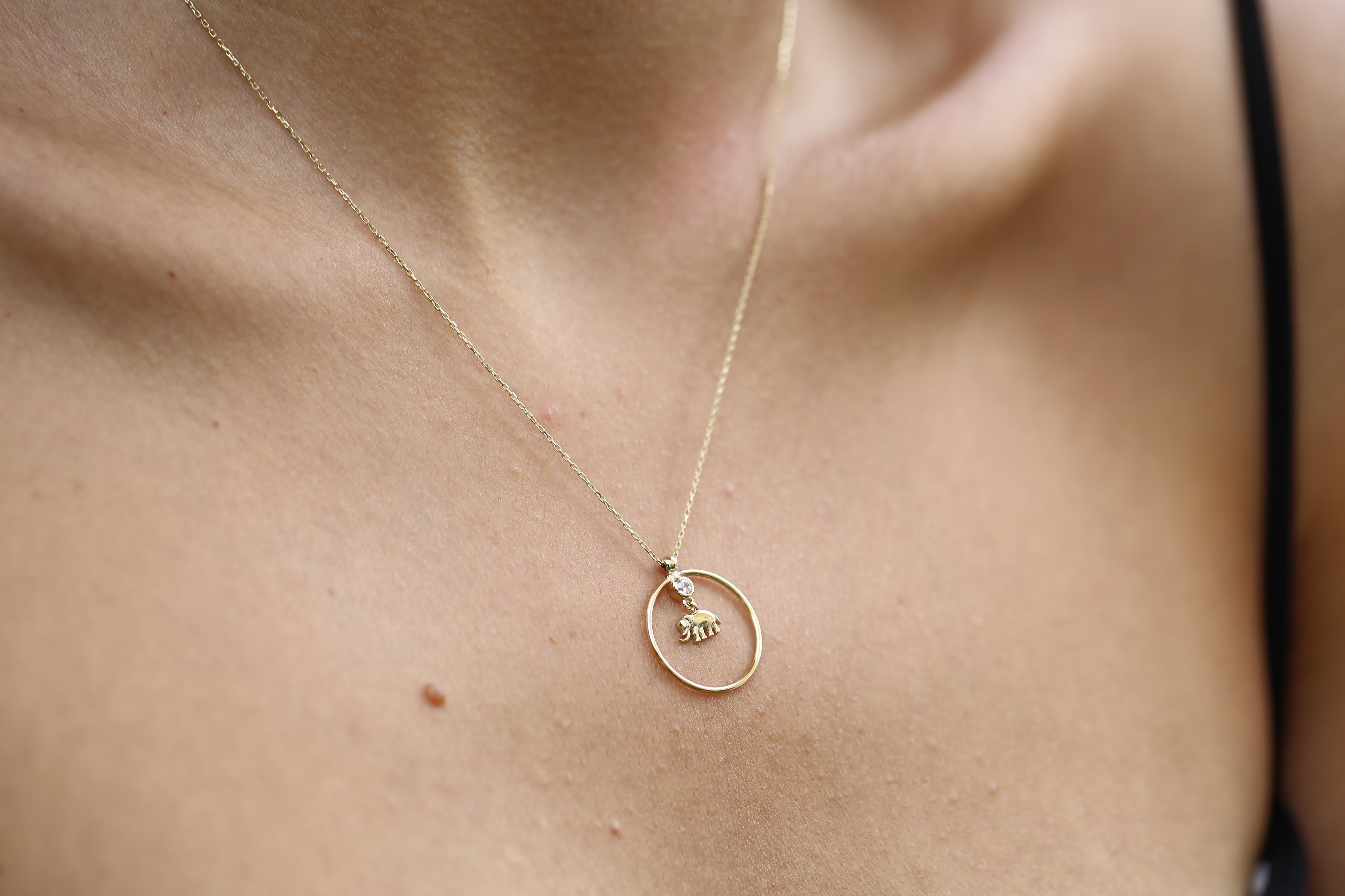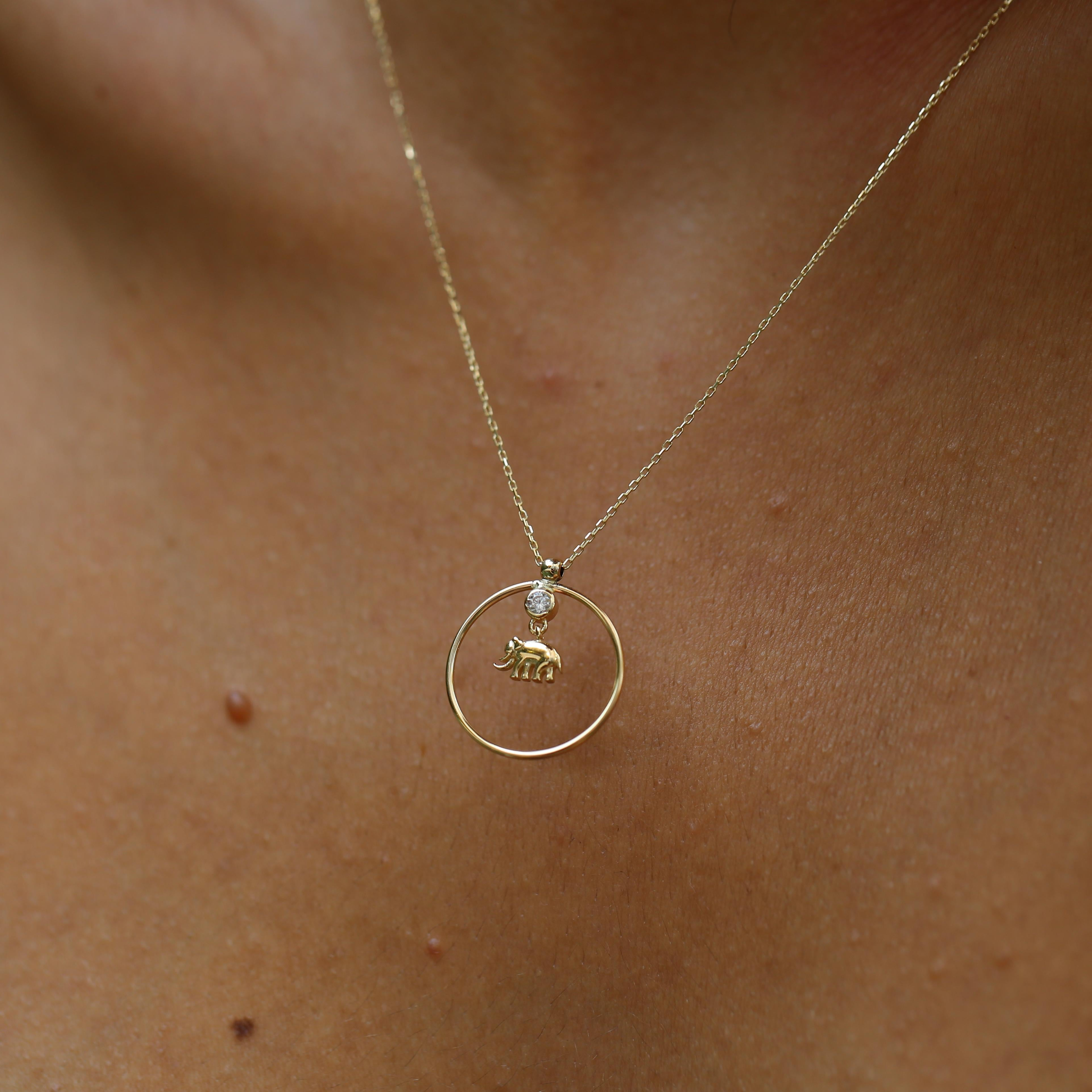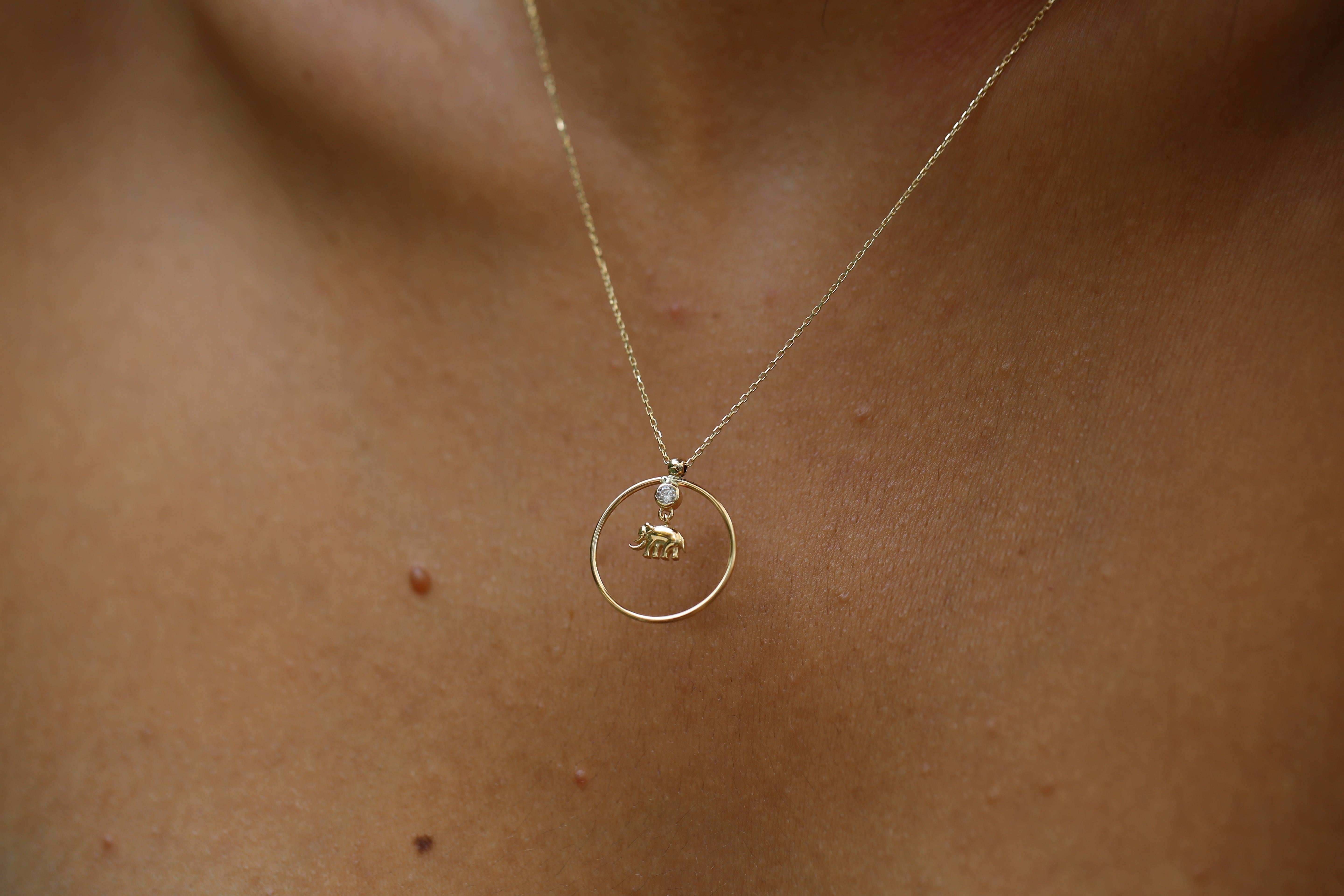 Fil figürü, pozitif enerjiyi ve mutluluğu simgelerken, çember yapısı ile birleşerek hoş bir denge sağlıyor. Tektaşın parıltısı, kolyeye zarif bir dokunuş ekliyor. Ömür boyu bakım ve onarım garantisi ile uzun ömürlü kullanım sunan bu kolye, hem günlük hayatta hem de özel anlarda tercih edilebilecek harika bir aksesuar.