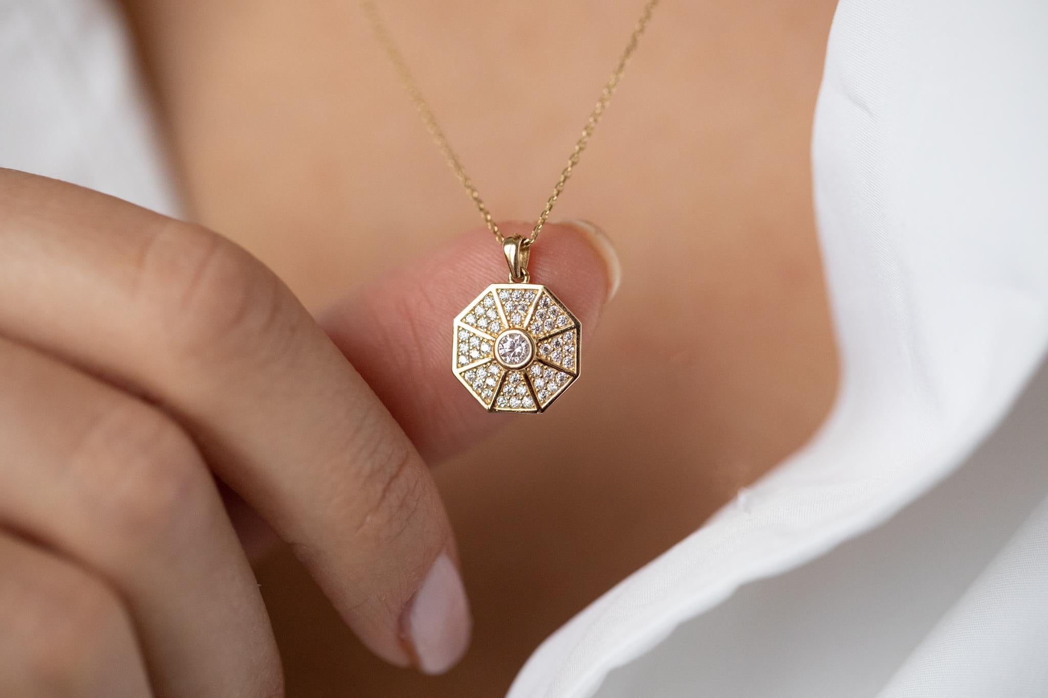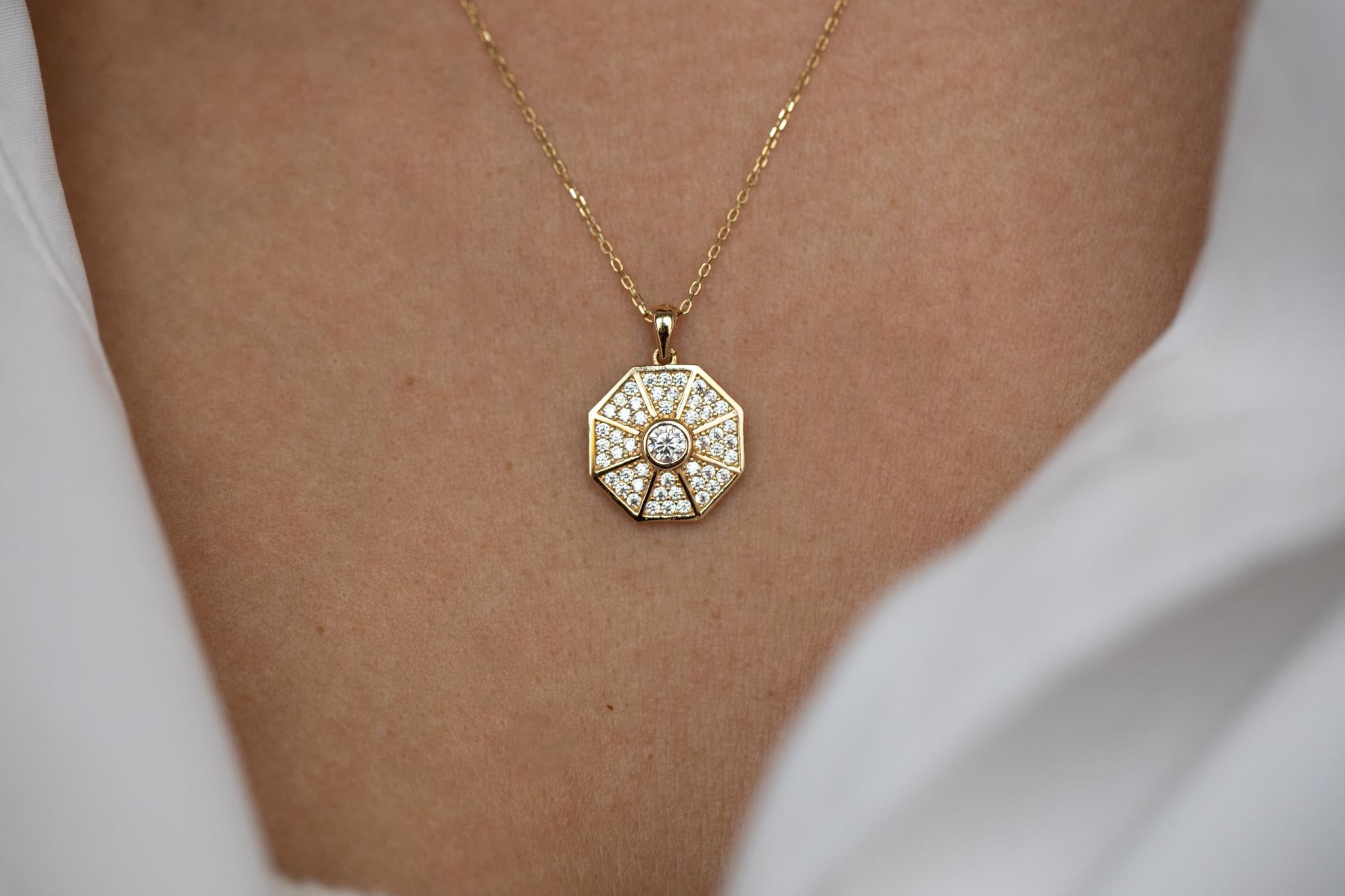 14 ayar altından üretilen bu kolye, hem günlük kullanıma hem de özel davetlere uygun yapısıyla her türlü kıyafetle mükemmel bir uyum sağlıyor. Modern ve çarpıcı tasarımı, stilinize taze bir dokunuş ekleyerek, her anınızı güzelleştiriyor. Taşlarla zenginleştirilmiş geometrik formu, kişisel tarzınızı ön plana çıkaran eşsiz bir parça olma özelliğini taşıyor.