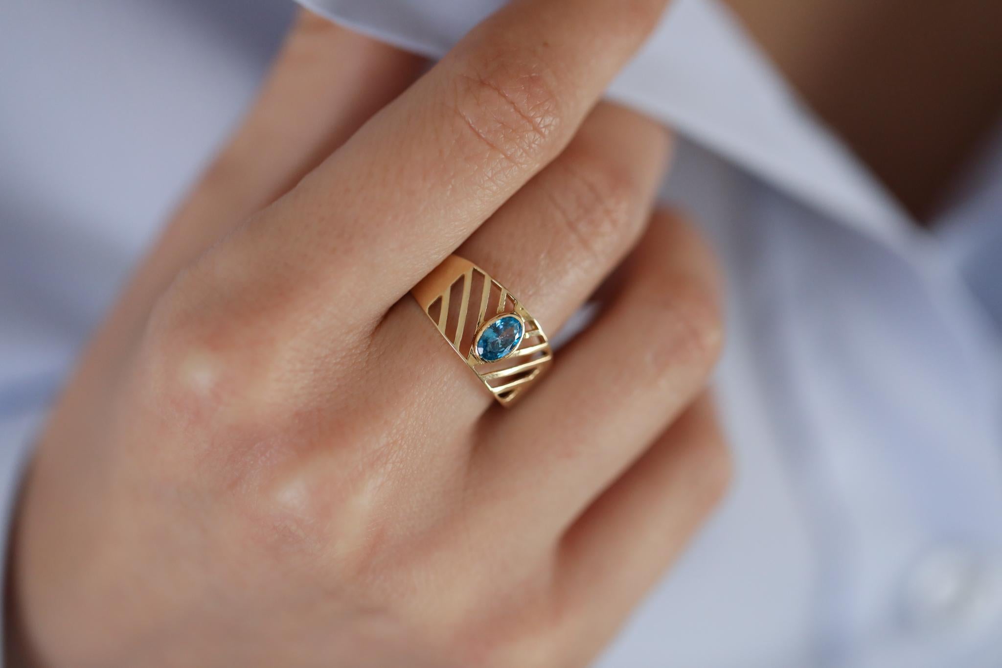 Mavi Oval Taşlı Modern Altın Yüzük, çağdaş tasarımı ve zarif detaylarıyla göz alıcı bir aksesuardır. Yüzüğün ana gövdesi, kesik bölümlü çizgilerle modern bir estetik anlayışla oluşturulmuştur. Orta noktada yer alan mavi oval taş, bu tasarımın odak noktası olup, sade ve şık bir görünüm sunar.
