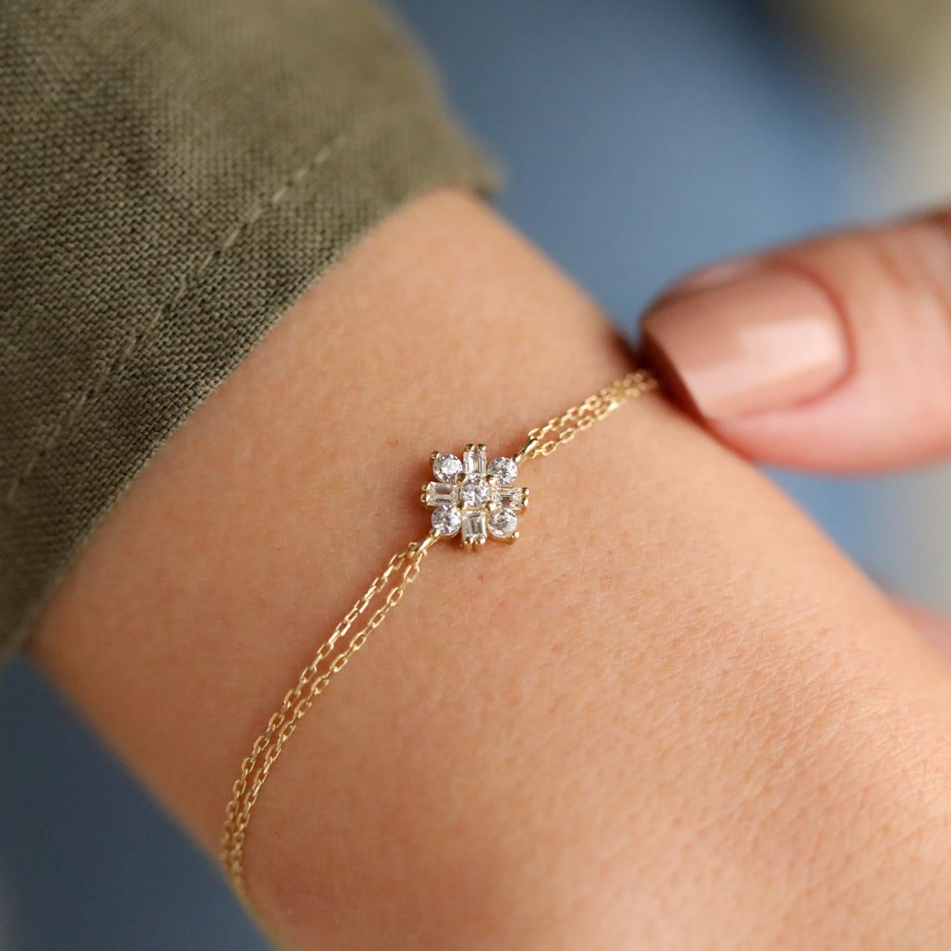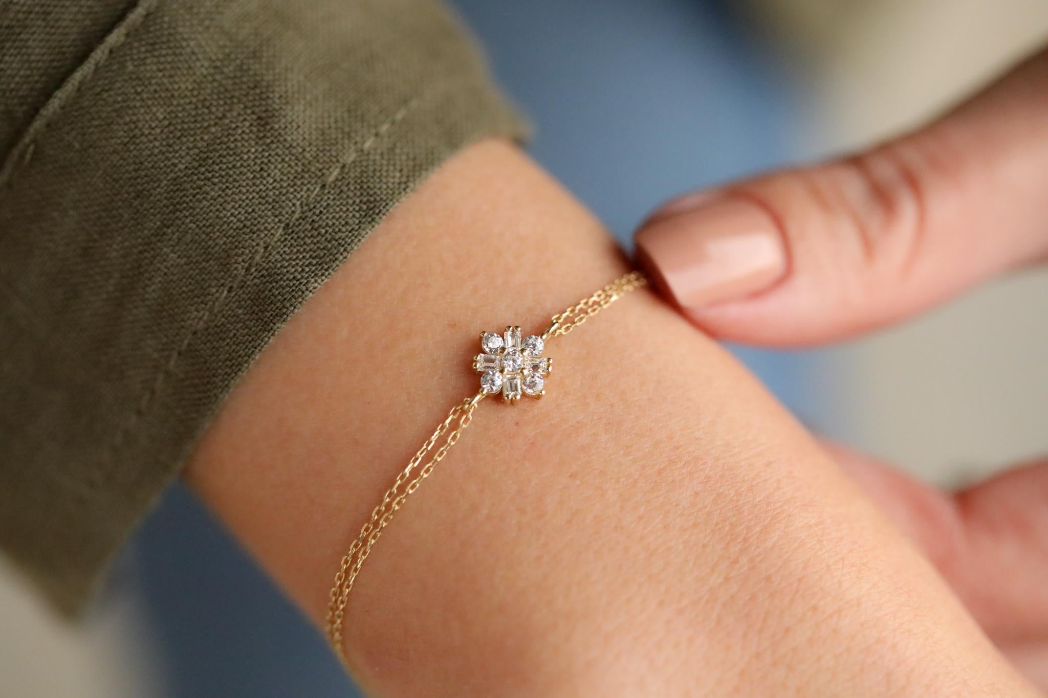 Taşlı Minimal Altın Bileklik, baget ve tektaşların çiçek formunda bir araya gelmesiyle zarif bir görünüm sunar. İncelikle tasarlanmış bu minimal bileklik, bileğinizde zarif bir çiçek bahçesi gibi ışıldarken her anınıza sofistike bir dokunuş katıyor. Çiçek motiflerinin sadeliği ve baget kesimin modern çizgisi, bu bilekliği hem günlük kullanıma hem de özel günlere uygun hale getiriyor.